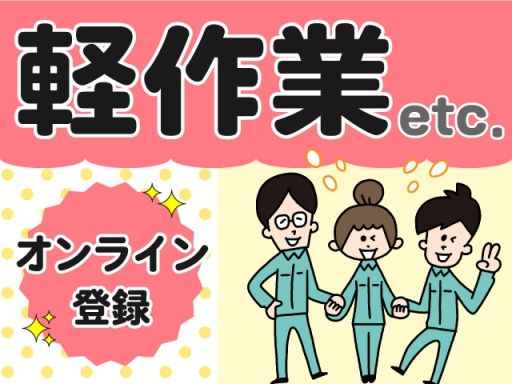 | 仕事内容 | \未経験・ブランクOK!/ 人気の軽作業スタッフ募集! 20代、30代40代、50代の方活躍中! ~あなたにピッタリのお... |